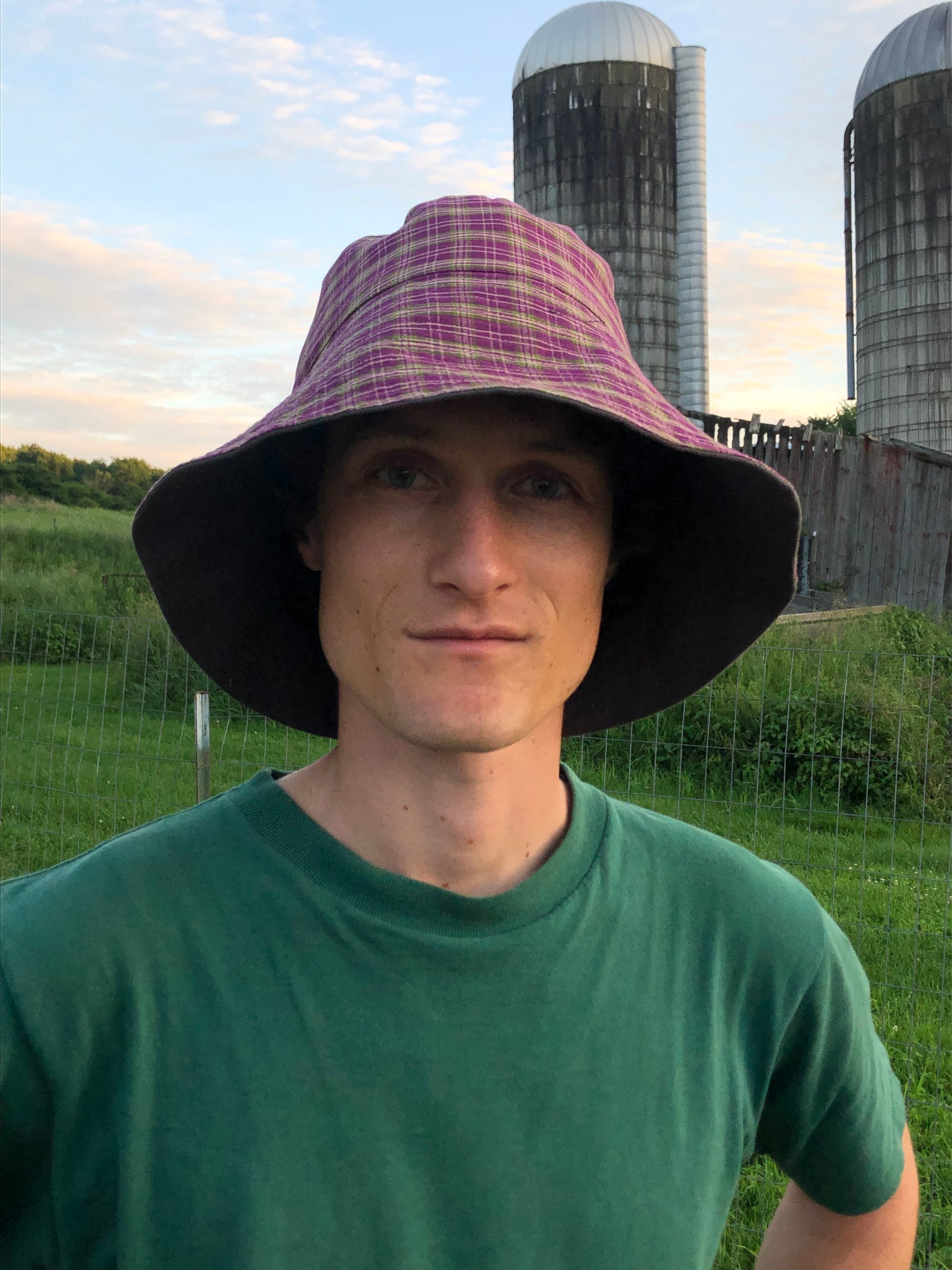 A wide brim bucket style hat. Reversible, with one side a fabulous yarn-dyed purple and green plaid and the other a charcoal gray canvas, both 100 % cotton. Adorable with the brim flipped up or down to shade the eyes.