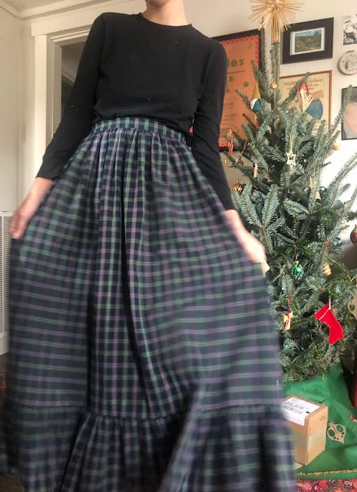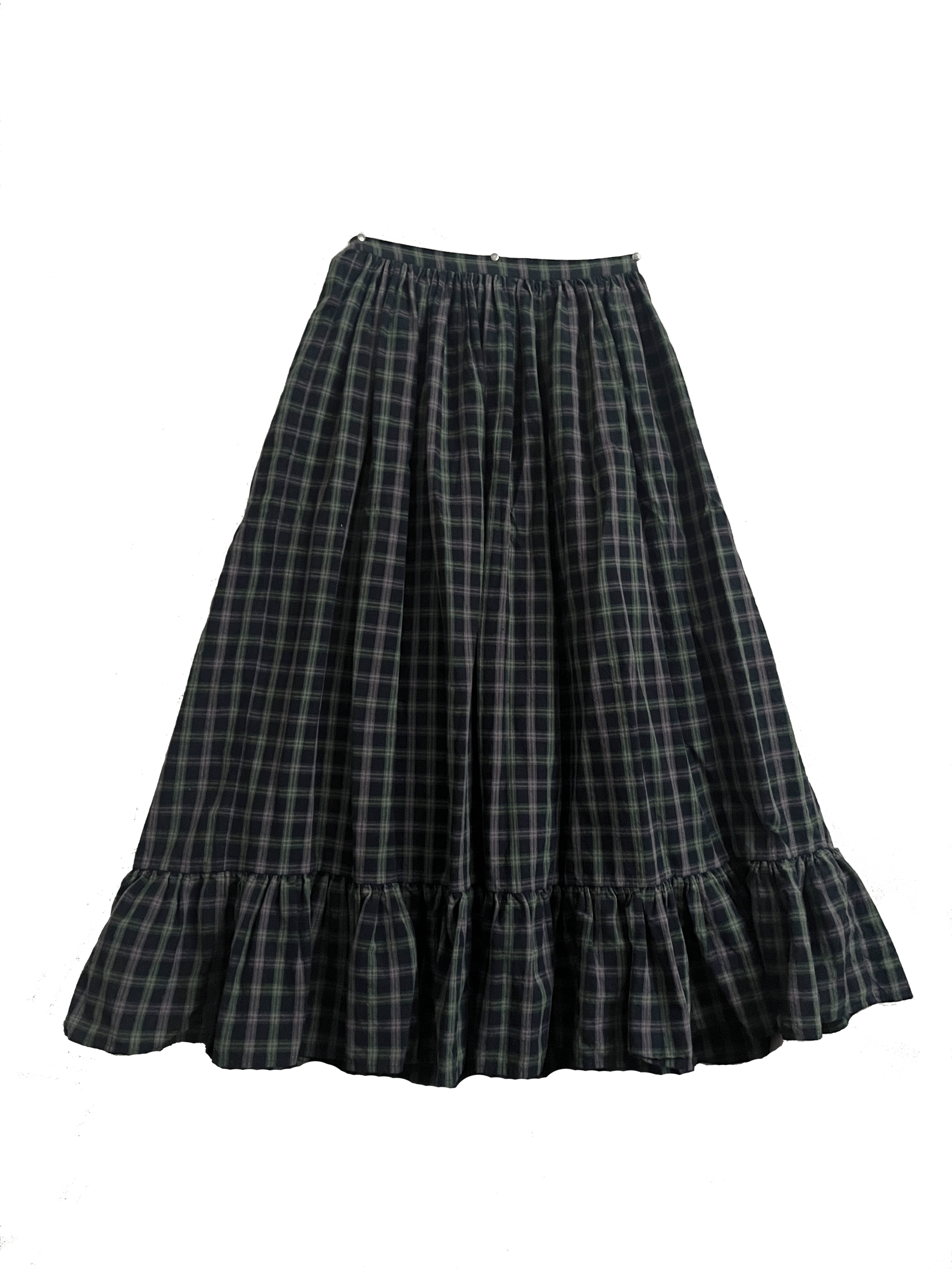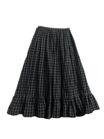 A voluminous full length skirt with a sweeping ruffle at the hem. Done up in a navy yarn-dyed plaid with accents of purple, green and tan. Features a drawstring at the back waist for full adjustability while maintaining a smooth waistband in front. An excellent choice for the holidays.